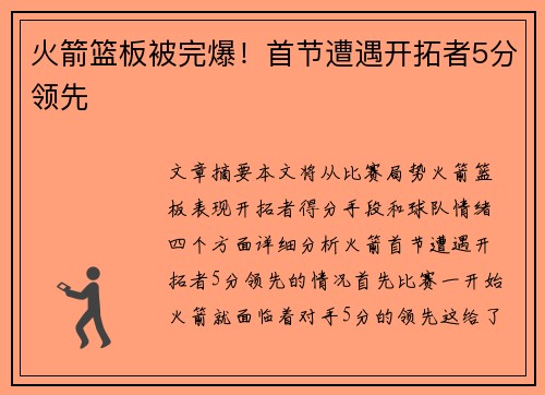 文章摘要:本文将从比赛局势、火箭篮板表现、开拓者得分手段和球队情绪四个方面详细分析火箭首节遭遇开拓者5分领先的情况。首先,比赛一开始,火箭就面临着对手5分的领先,这给了开拓者更强势的心理优势。其次,火...